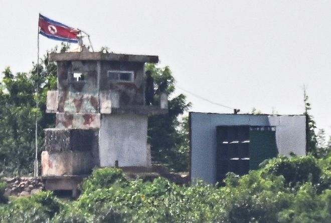 5일 경기 파주시 접경지역에서 바라본 북한군 초소에 대남 확성기가 철거되지 않은 채 남아 있다. 우리 군은 남북간 긴장 완화를 위해 지난 4일부터 고정식 대북 확성기를 철거한다고 밝힌 바 있다. 2025.8.5 이지훈 기자 |
