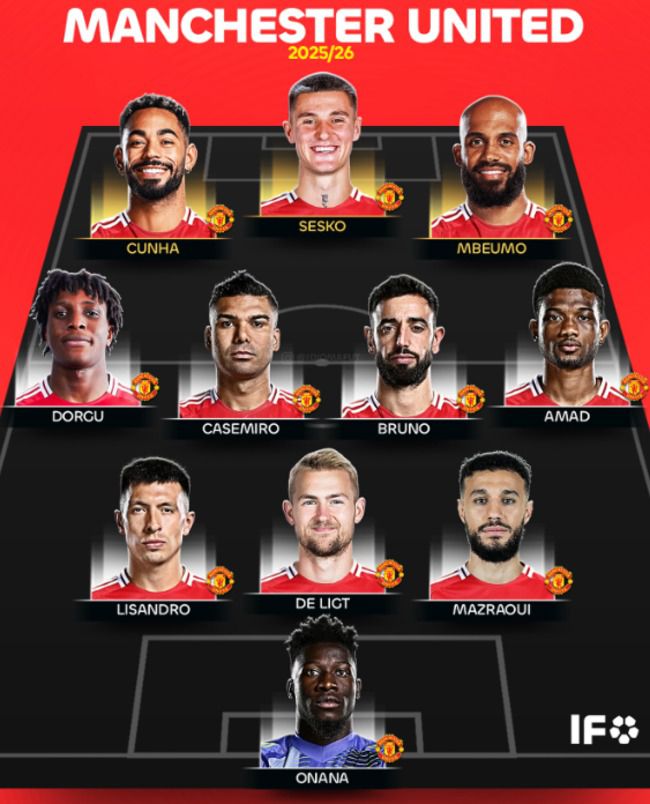 이러한 상황에서 맨유의 2025-26시즌 예상 라인업이 공개됐다. 축구 콘텐츠 매체 '아이디오 마풋'은 맨유의 다가올 시즌 라인업을 자체적으로 예상해 발표했는데 공격진은 올여름 팀에 합류한 선수들로만 구성됐다.
