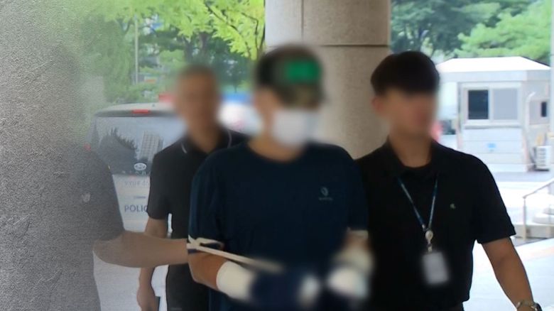 흰색 마스크 차림에 모자를 눌러 쓴 남성이 포승줄에 묶인 채 걸어 들어갑니다.