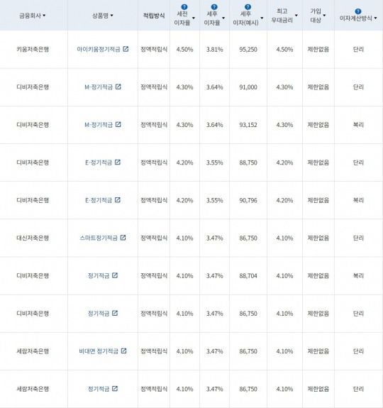 이어 DB저축은행의 'M-정기적금'이 4.30%의 세전이자율을 제공하며 뒤를 이었다.