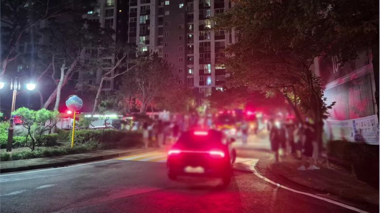 아파트 단지 안 소방차 여러 대가 줄지어 서 있고, 집 밖으로 나온 주민들의 모습도 보입니다.