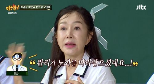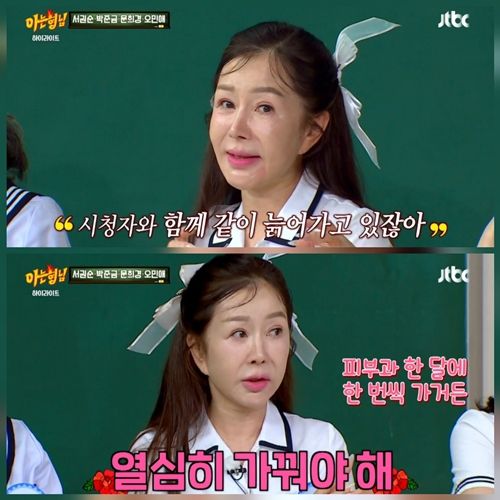 배우는 시청자와 함께 늙어가는 만큼 그들을 슬프게 하지 않으려면 열심히 가꿔야 한다”며 피부과를 한 달에 한 번 방문한다는 관리 비결을 공개했다. 이어 “선생님이 ‘관리가 노화를 따라잡았다’고 하더라”고 말해 놀라움을 자아냈다.