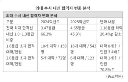 2025학년도 의대 수시 합격선은 모집 정원 확대로 인해 크게 낮아졌던 것으로 나타났다. 종로학원에 따르면, 전국 39개 의대의 수시 최저 합격선은 4.65등급으로, 전년도 3.47등급보다 하락했다. 내신 1.0~1.3등급 구간대의 최상위권 합격생 비중은 2024학년도 66.3%에서 2025학년도 45.9%로 감소했으며 , 내신 1등급 중후반대와 2등급 이하의 학생들이 대거 합격한 것으로 확인됐다.