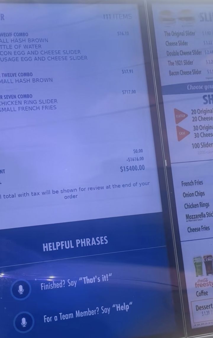 그는 소시지 에그 치즈 슬라이더, 베이컨 에그 치즈 슬라이더, 해시브라운, 생수 등 약 34달러(약 4만원) 상당의 메뉴를 주문했으나, AI는 이를 147.6달러(약 20만원)로 잘못 계산했다.