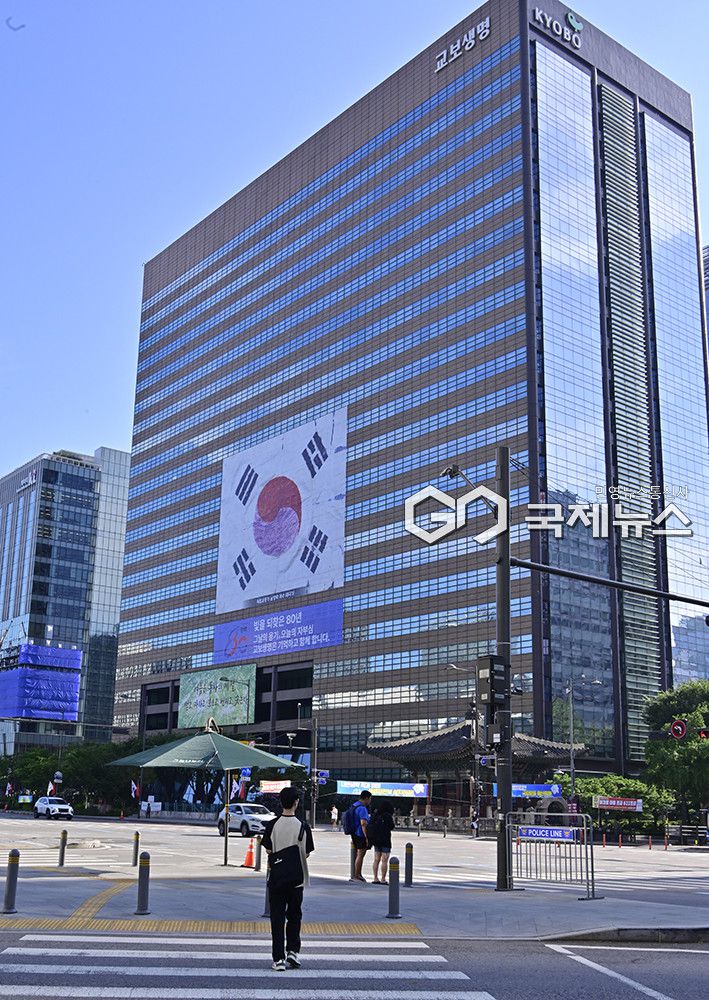 (서울=국제뉴스) 안희영 기자 = 광복절 80주년을 닷새 앞둔 10일 서울 광화문광장과 서울광장 일대 주요 건물 외벽에 초대형 태극기가 게양되어 광복의 기쁨을 함께하고 있다.