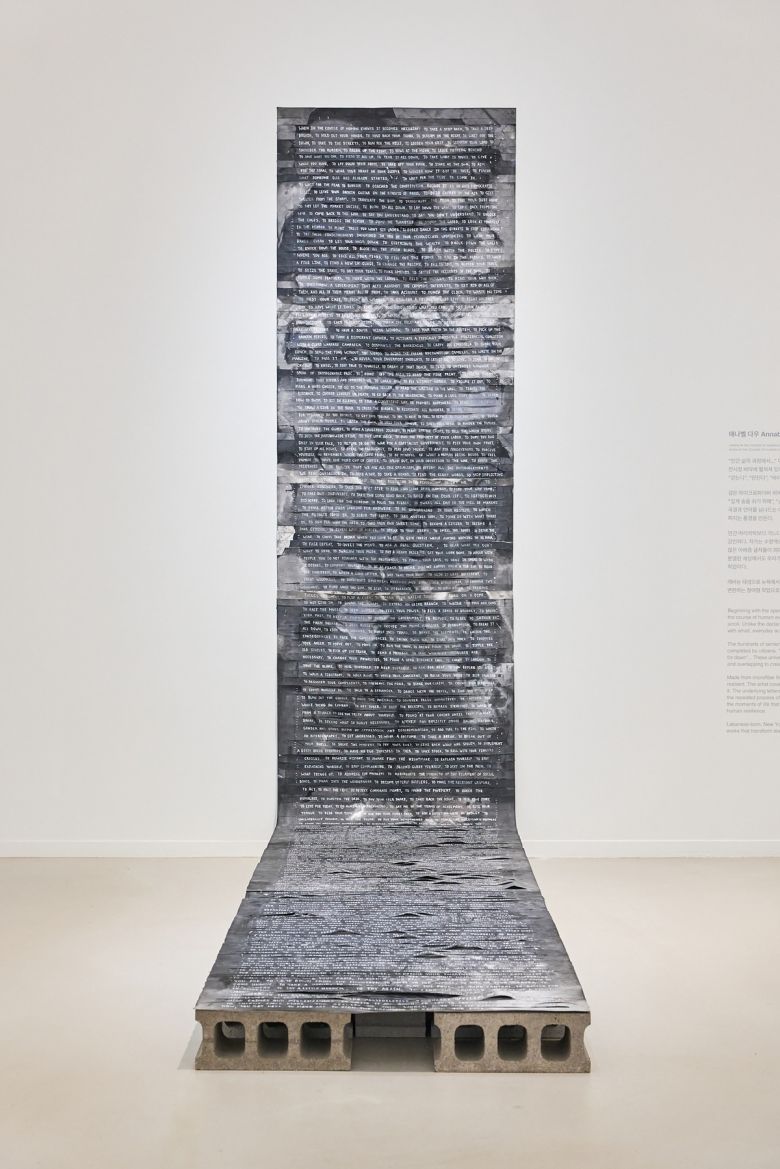 여러 사람의 참여로 만든 작품이 눈에 띈다. 레바논계 미국 작가 애나벨 다우의 ‘WHEN IN THE COURSE OF HUMAN EVENTS’(2019~2020)는 시민 수백명에게 받은 문구를 검은 마이크로파이버에 흰색 수정액으로 적어내 참여형 작품으로 만들었다. 작품 제목은 1776년 발표된 미국 독립선언서의 첫 부분으로 ‘인간 삶의 과정에서’로 번역된다. 다우는 수백명에게 인간 삶의 과정에서 ‘필수적인 것’이 무엇인지를 물었고, ‘한걸음 물러서는 것, 깊게 숨을 내쉬는 것, 눈물을 참는 것, 새벽을 기다리는 것’ 등 다양한 것이 적혔다. 인간의 삶에는 ‘국가의 독립’ 같은 무겁고 숭고한 것이 필요하기도 하지만, 때로는 일상적이고 습관적인 행위들이 삶을 지탱할 때도 있다는 것을 작품이 내포하고 있다.