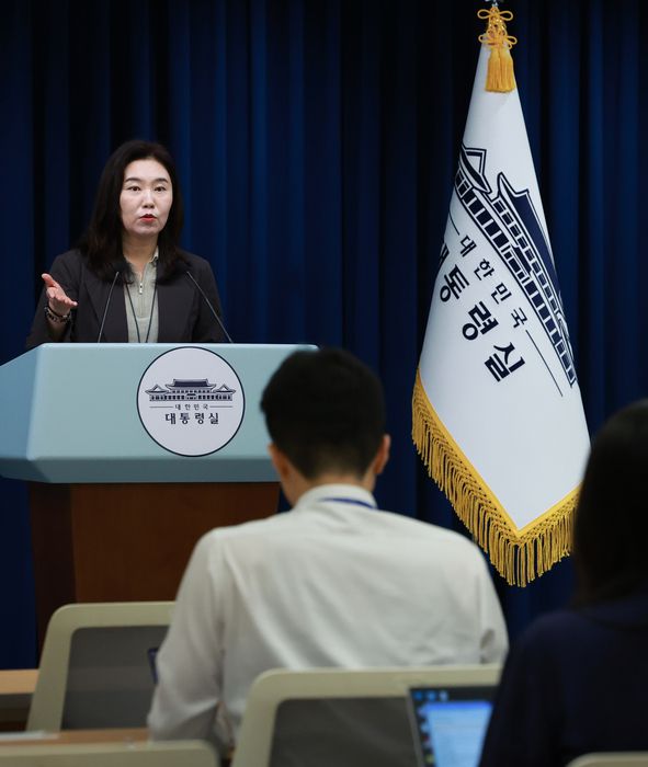 취재진 질문에 답하는 강유정 대통령실 대변인 (서울=연합뉴스) 홍해인 기자 = 강유정 대통령실 대변인이 9일 서울 용산 대통령실 청사에서 산재 관련 대통령 지시사항 등에 대한 브리핑을 마친 뒤 취재진 질문에 답하고 있다. 2025.8.9 hihong@yna.co.kr (끝) |