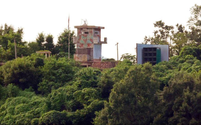 북한이 전방 일부 지역에서 대남확성기를 철거하는 활동이 식별된 지난 9일 경기도 파주시 접경지역에서 바라본 북한 임진강변 초소에 대남 확성기가 설치돼 있다. 이날 국방부는 북한이 대남 확성기를 설치한 지역은 40여곳으로, 일부 지역에서는 이미 철거를 마친 것으로 파악된다고 밝혔다. [연합] |