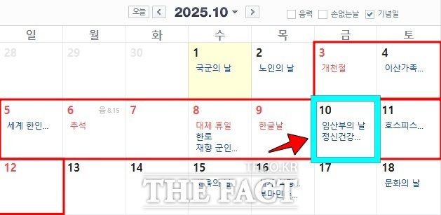 올해 10월은 3일 개천절부터 4일 토요일, 5~7일 추석 연휴, 8일 대체공휴일, 9일 한글날이 이어진다. 여기에 금요일인 10월 10일이 임시공휴일로 지정되면 12일 일요일까지 총 10일 연속 휴무가 가능하다. 이미 3일부터 9일까지 7일 연휴가 확정돼 있어, 10일 하루만 연차를 사용해도 장기 휴가를 즐길 수 있다.