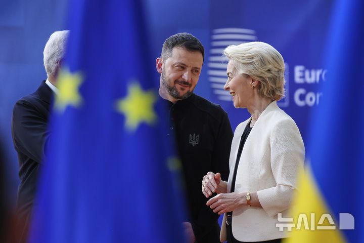 [브뤼셀=AP/뉴시스] 볼로디미르 젤렌스키(가운데) 우크라이나 대통령이 지난 3월 6일(현지 시간) 벨기에 브뤼셀에서 열린 유럽연합(EU) 27개국 특별 정상회의에 참석해 우르줄라 폰데어라이엔 EU 집행위원장과 대화하고 있다. 젤렌스키 대통령은 "유럽의 재무장 노력을 환영한다"라며 "이 계획에 따른 국방 자금으로 유럽 모든 지역을 강화해야 한다"라고 말했다. 2025.03.07. |