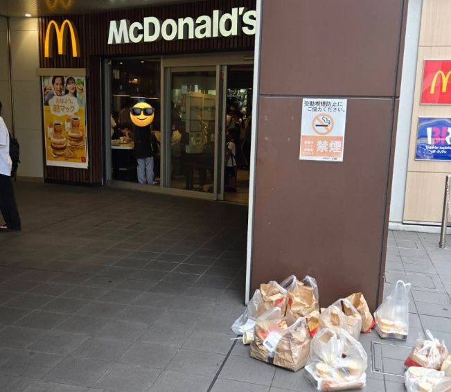 10일 X(엑스) 등 SNS(소셜미디어)에는 일본 맥도날드 매장 인근에 수십 개의 햄버거 세트가 버려진 사진이 확산했다.