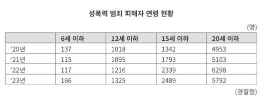 10일 파이낸셜뉴스가 경찰청에 요청해 받은 '성폭력 범죄 피해자 연령 현황' 등 통계에 따르면 전체 20세 이하 성폭력 피해자 수는 2020년 7450명에서 2023년 9772명으로, 4년 간 31.2% 증가했다. 같은 기간 16~20세 이하 피해자는 4953명에서 5792명으로 17%, 13~15세 이하 피해자는 1342명에서 2489명으로 85.5% 급증했으며 7~12세 이하 피해자도 1018명에서 1325명으로 30.2% 늘었다. 특히 6세 이하 영유아 피해자 수가 137명에서 166명으로 21.2% 뛰어 저연령 아동을 대상으로 한 성폭력 피해가 한층 심각해지고 있다는 분석이다.