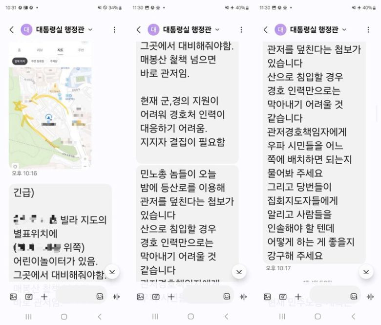 앞서 성 전 행정관은 지난 1월3일 윤 전 대통령 1차 체포영장 집행이 실패한 뒤 윤 전 대통령 체포를 촉구하는 시민들이 관저로 들어올 수 있으니 지지자들을 특정 장소로 이동시켜 이를 막아달라고 신 대표에게 요청하기도 했다. “별표 위치에 어린이 놀이터가 있음. 그곳에서 대비해줘야 함. 매봉산 철책 넘으면 바로 관저임”, “현재 군, 경의 지원이 어려워 경호처 인력이 대응하기 어렵다. 지지자 결집이 필요”하다며 윤 전 대통령 지지자들을 ‘방패’로 활용하려 한 것이다.