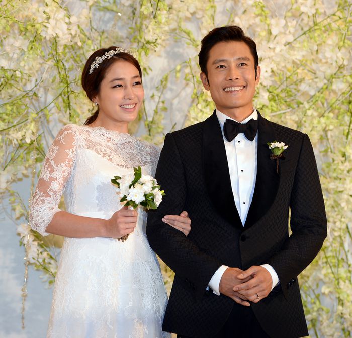 이민정(왼쪽)과 이병헌이 서울 그랜드 하얏트호텔에서 결혼식을 앞두고 취재진을 향해 포즈를 취하고 있다. 2013. 8. 10. 스포츠서울 DB. |