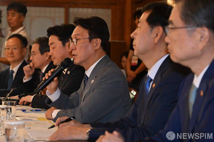 [서울=뉴스핌] 윤창빈 기자 = 김민석 국무총리가 10일 서울 종로구 총리 서울공관에서 열린 고위당정협의회에서 모두발언을 하고 있다. 2025.08.10 pangbin@newspim.com