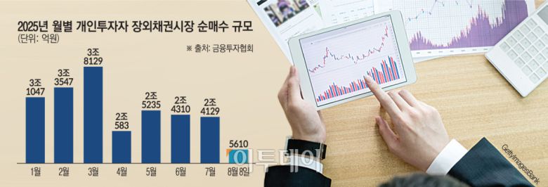 10일 금융투자협회에 따르면 지난달 장외채권시장에서 개인은 2조4129억 원 순매수했다. 1월(3조1047억 원), 2월(3조3547억 원), 3월(3조8129억 원) 등 연초 3조 원대 후반까지 커졌던 순매수 규모는 4월(2조583억 원), 5월(2조5235억 원), 6월(2조4310억 원)에 걸쳐 2조 원대로 내려왔다.