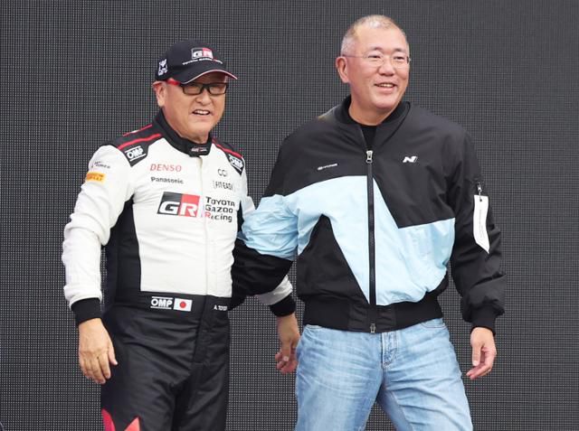 정의선(오른쪽) 현대차그룹 회장과 도요다 아키오 일본 도요타그룹 회장이 2024년 10월 경기 용인시 에버랜드 스피드웨이에서 열린 '현대 N x 도요타 가주 레이싱 페스티벌'에서 함께 무대에 올라 인사를 하고 있다. 용인=연합뉴스