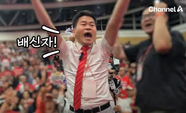 지난 8일 대구 북구 엑스코에서 열린 국민의힘 전당대회 대구·경북 합동연설회에서 한국사 강사 출신 보수 유튜버 전한길씨가 김근식 최고위원 후보가 연설하는 동안 객석에서 일어나 “배신자”를 외치며 당원들의 동참을 유도하고 있다. 채널에이(A) 유튜브 화면 갈무리.