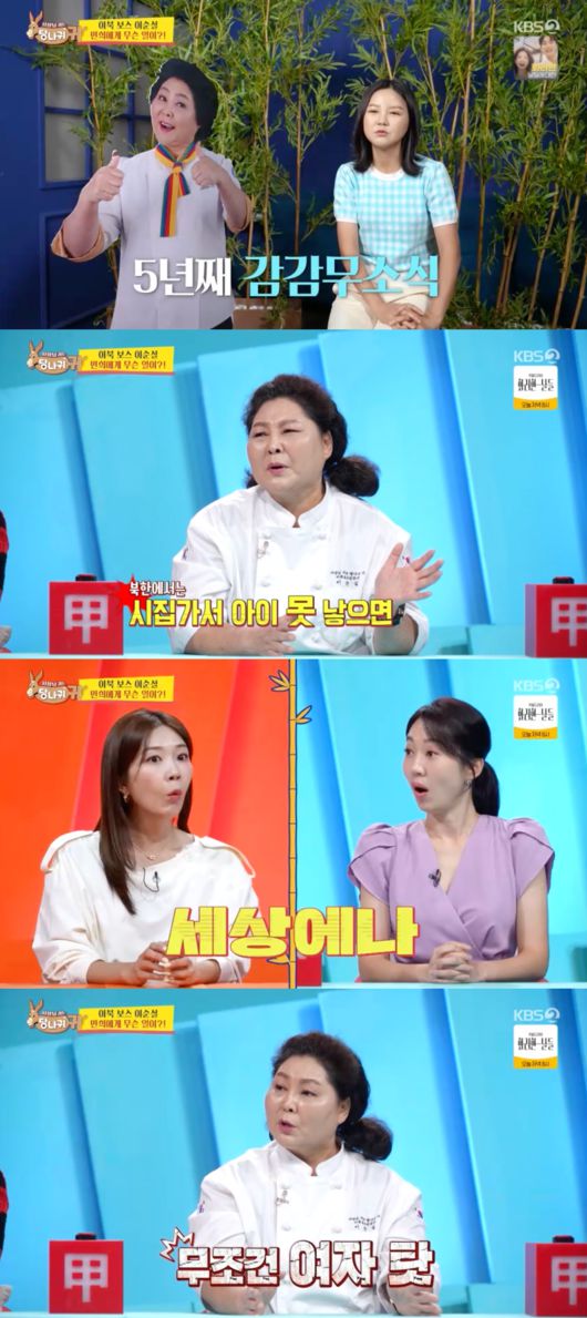 이순실은 “북한에서는 시집가서 애를 못 낳으면 쫓겨나. 남자가 못 낳든, 여자가 못 낳든 검사가 없어도 여자가 잘못이라고 한다”고 털어놨다. 이정민은 “이거 완전히 조선시대적 사고잖아요”라고 놀라워했고, 이순실은 “민희가 이런 상태라고 해도 병원가서 부끄러워서 말을 못한다”고 전했다.