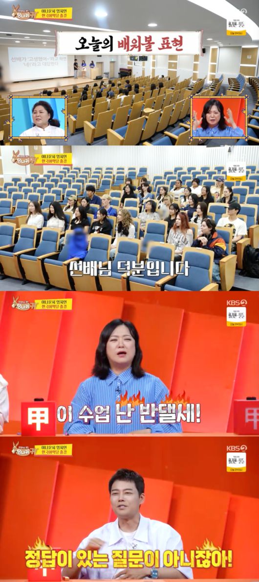 엄지인은 선배와의 메신저 연락, 식사 예절을 언급하며 “다 선배님 덕분입니다”라고 일동복창하게 했고, 스튜디오에서 ‘갑 버튼’이 연달아 울리며 “이게 대체 무슨 강의냐”, “학생들이 한국 싫어하며 어쩌냐”고 걱정했다.