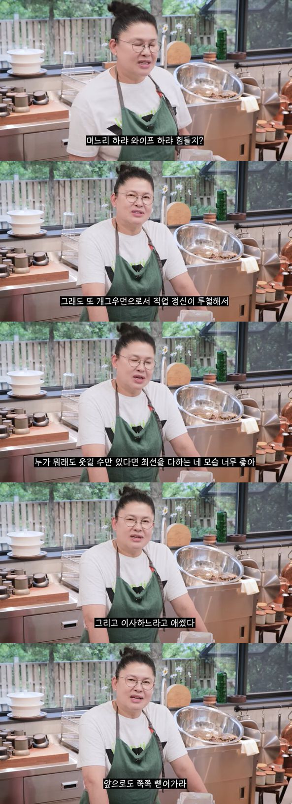 세 음식 준비를 모두 마친 이영자는 "애들 키우랴, 방송 일하랴, 며느리 하랴, 와이프 하랴 힘들지? 그래도 또 개그우먼으로서 직업 정신이 투철해서 누가 뭐래도 웃길 수만 있다면 최선을 다하는 네 모습 너무 좋다"고 전했다.