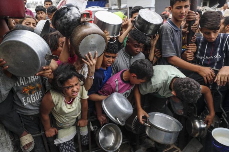 가자지구 가자시티의 한 급식소에서 지난 4월 무료 급식을 받으려는 팔레스타인 난민 어린이들이 몰려들고 있다. 이스라엘군이 가자지구에 대한 식량 등 구호품 반입을 봉쇄한 뒤 가자지구의 인도주의적 참상이 극에 달하자, 유엔이 봉쇄 해제를 적극 요구하고 있다. 유엔 인도주의 업무조정국(OCHA)은 연료마저 떨어져 긴급구호에만 이를 배정하고 있다고 지난달 7일 밝혔다.신화/뉴시스 |