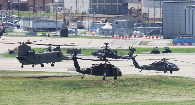 지난 7일 경기도 평택시 캠프 험프리스에서 치누크 헬기(왼쪽)와 블랙호크 헬기가 이동하고 있다. 연합뉴스