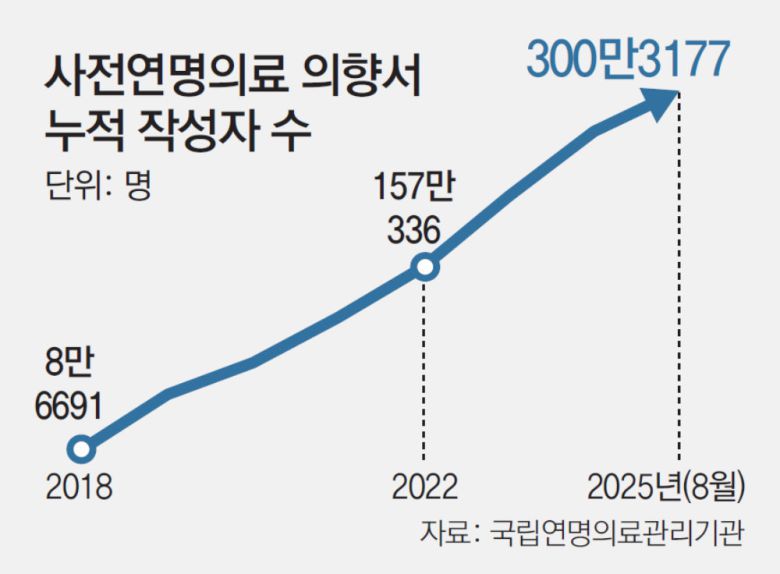 10일 국립연명의료관리기관에 따르면 연명의료를 받지 않겠다는 사전연명의료의향서를 등록한 사람은 9일 기준 300만3117명이었다. 전체 성인 인구의 6.8%다.