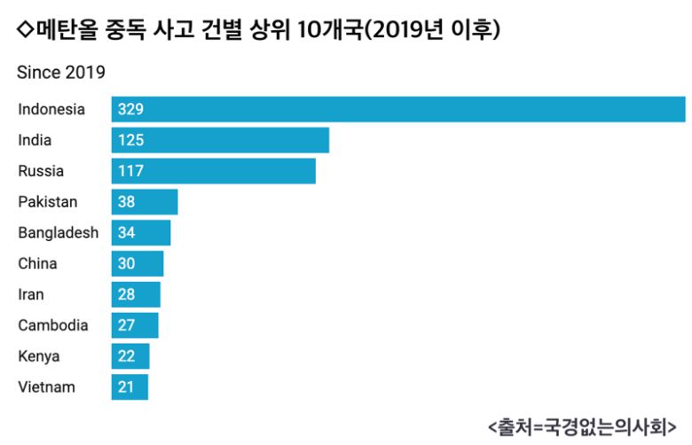 국경없는의사회는 지난 2019년부터 지난해 11월 현재 943건의 사건이 발생하면서 3만9000명 이상이 중독되고 약 1만2900명이 사망했다고 전했다. 그러면서 외국인 관광객이 많이 찾는 아시아에서 메탄올을 첨가한 불법 주류가 많이 유통되고 있다고 전하기도 했다.