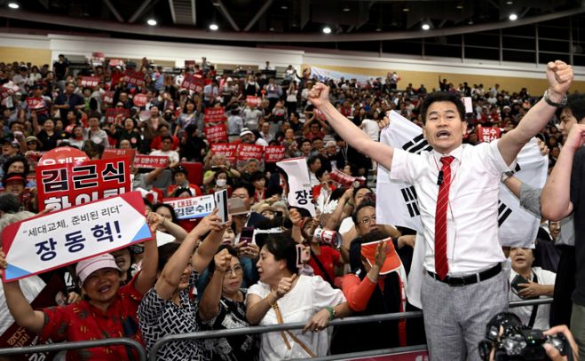 국민의힘이 8·22 전당대회 과정에서 보여 주고 있는 작태는 국민의 지지를 완전히 포기한 심리 상태가 아니고는 설명이 되지 않는다. 계엄과 탄핵의 원죄를 씻으려는 노력은커녕 탄핵반대파 목소리가 오히려 기세를 올리고 있다. 지난 8일 대구·경북 합동연설회에서는 한국사 강사 출신의 유튜버 전한길씨가 탄핵찬성파 후보 연설 도중 “배신자” 구호를 외치는 황당한 사태가 빚어졌다. 탄핵반대파가 구호를 외치는 가운데 탄핵찬성파는 물병을 집어던지는 등 연설회는 그야말로 난장판이 됐다.