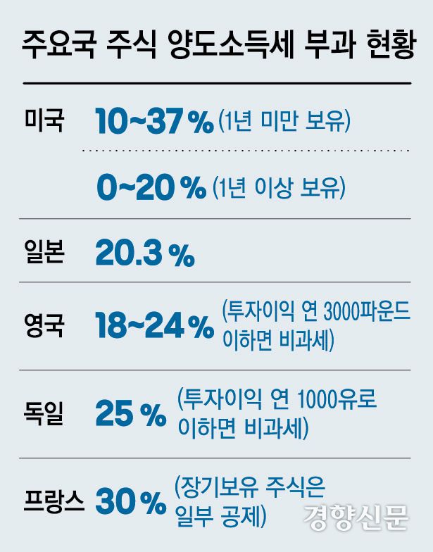 특히 금투세는 5년간 금융상품의 수익과 손실을 서로 상쇄해주는 ‘손익통산’과 금융자산을 보유하는 동안 세금을 안 내도 되는 ‘과세 이연’을 허용한다는 장점도 있다. 대주주의 연말·연초 세금 회피 목적의 ‘팔고 다시 사기’ 현상도 줄어들 수 있다. 김현동 배재대 경영학과 교수는 “금투세는 손익통산, 이월공제를 도입해 기존 주식 양도소득세를 냈던 사람들에게는 오히려 유리한 부분이 있다”며 “장기 투자도 유도할 수 있다”고 말했다.