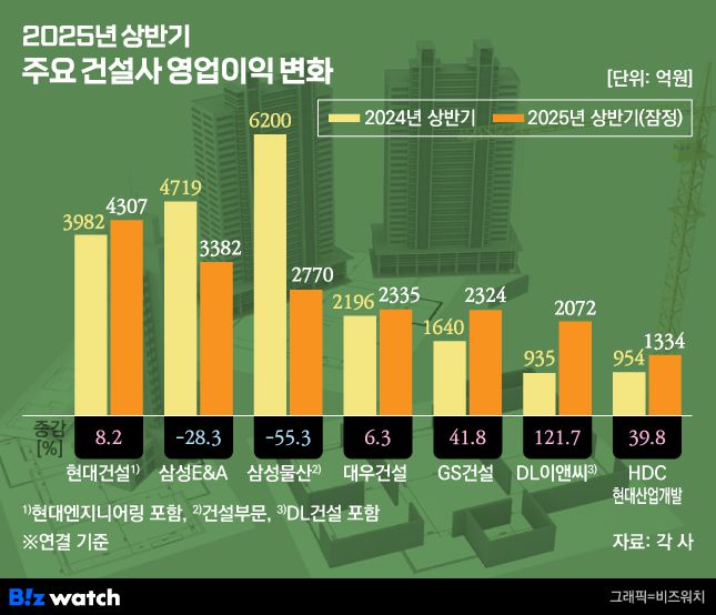 2025년 상반기 주요 건설사 영업이익 변화/그래픽=비즈워치 |
