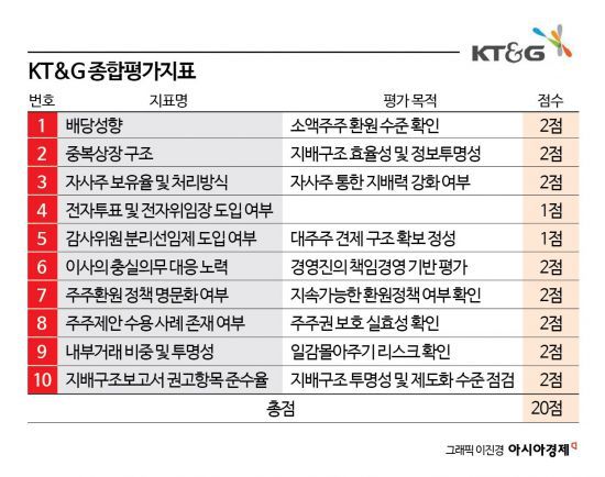 이번 평가는 아시아경제가 시가총액 기준 상위 식품·음료 상장사 20곳을 대상으로 배당 성향, 중복상장 구조, 자사주 처리 방식, 이사회 운영 등 10개 항목을 정량·정성 평가한 결과다. KT&G는 총점 20점 만점 중 18점을 기록했다.