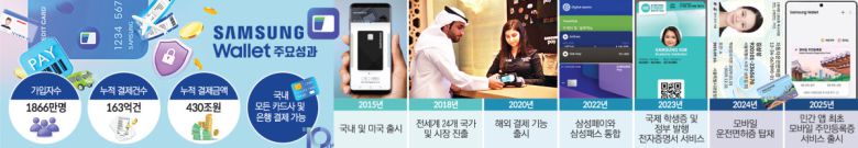 11일 삼성전자에 따르면 국내 삼성월렛 가입자는 2015년 160만 명에서 현재 1866만 명으로 10년 새 11배 이상 증가했다. 연간 결제금액은 2016년 3조6000억 원에서 지난해 88조6,000억 원으로 약 24배 늘었고, 누적 결제액은 430조 원을 넘어섰다. 이는 국내총생산(GDP)의 약 20%에 맞먹는 규모다.