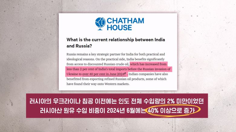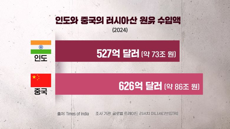 중국의 러시아산 원유 수입액이 2024년 626억 달러, 우리 돈으로 하면 약 86조 원인데 인도에 527억 달러, 우리 돈으로 약 73조 원을 넘어섰음에도 불구하고 트럼프 대통령이 인도를 선택적으로 비판하고 있다, 이렇게 보도를 하기도 했습니다.