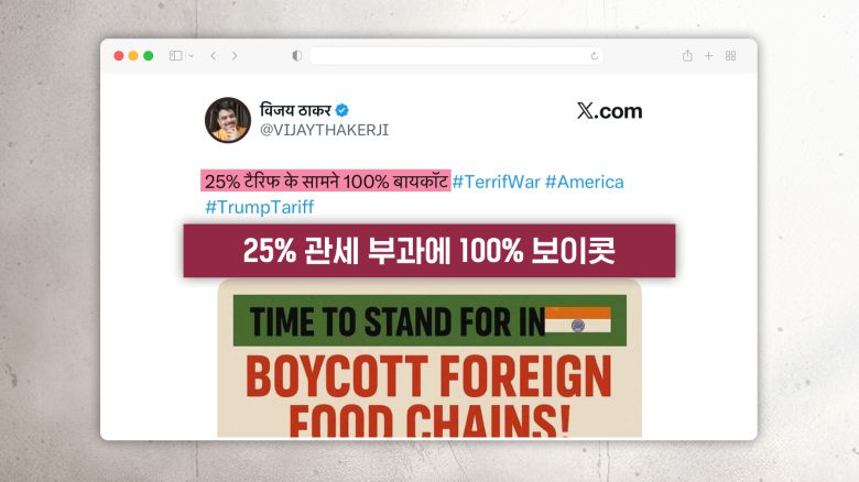 그런데 미국이 어제 총 50% 관세를 인도에 부과하니까 간디 전 대표는 자신의 SNS에 "트럼프 대통령의 50% 관세는 경제적인 협박이다"라고 하면서 "인도의 불공정한 무역 협정을 강요하려는 시도다"라고 했습니다.