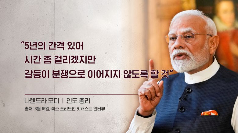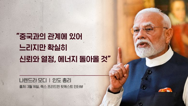 그런데 이러한 상황 속에서 조용히 웃고 있는 국가가 있습니다. 바로 중국입니다. 사실 인도는 1962년 국경 분쟁 이후에 중국과 오랜 기간 긴장된 관계를 이어왔고요. 또 2020년에 라다크 갈완 계곡에서 또 인도군과 중국군 간에 충돌이 벌어지면서 관계가 급격히 다시 악화된 상태였거든요. 그런데 갑자기 올해 초를 기점으로 중국과 관계 회복에 나서는 모습이 포착이 됩니다. 지난 3월 16일에 공개가 된 팟캐스트 인터뷰에서 모디 총리가 이런 말을 합니다.