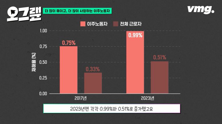 2017년 이주노동자의 재해율은 0.75%, 전체 대한민국 근로자는 0.33%입니다. 2023년엔 각각 0.99%와 0.51%로 증가했고요. 대한민국의 모든 노동자들의 재해율이 과거보다 더 높아진 것도 문제지만, 격차를 보면 여전히 이주노동자의 재해율이 2배 가까이 높습니다.