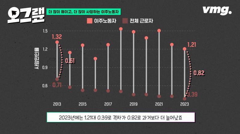 사망자 규모에서도 이 격차는 이어집니다. 2013년 외국인 근로자의 사망만인율은 1.32, 반면 전체 국내 근로자는 0.71로 0.61의 격차가 납니다. 2023년에는 1.21대 0.39로 격차가 0.82로 과거보다 더 늘어났죠.