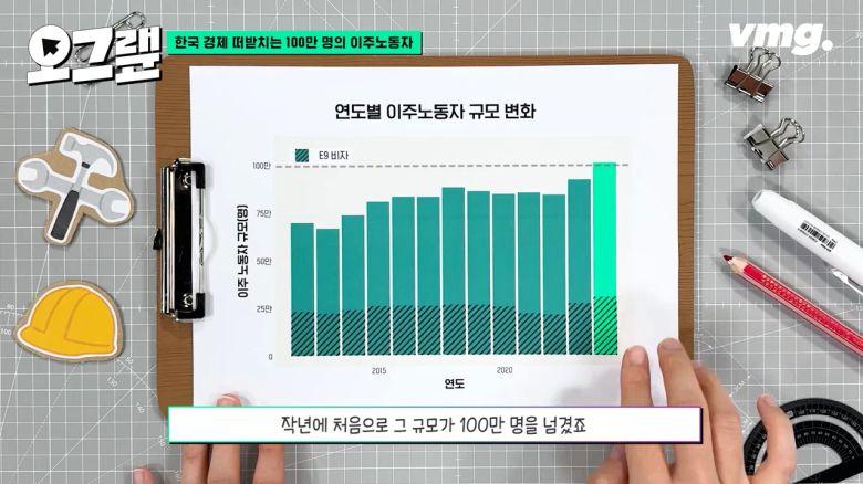 대한민국에서 취업을 해서 돈을 버는 외국인 규모는 꾸준히 늘고 있습니다. 작년에 처음으로 그 규모가 100만 명을 넘겼죠. 체류 자격별로 살펴보면 비전문취업 비자가 30만 2천 명으로 전체의 30%를 차지해 가장 많았습니다. 이 비전문취업 비자가 앞서 이야기한 지게차 괴롭힘을 당했던, 또 돼지농장에서 사망한 이주노동자들이 받았던 비자입니다. 비전문취업 비자 이야기는 조금 뒤에 더 자세히 다루기로 하고요 이주노동자 규모 이야기를 좀 더 해보겠습니다.