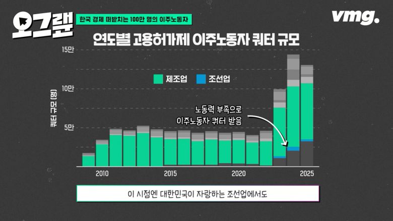 2009년부터 올해까지 매년 할당된 규모를 보면 단연 제조업의 비율이 가장 많습니다. 연도별로 보면 특히 2023년과 2024년에 그 규모가 크게 늘었죠? 이 시점엔 대한민국이 자랑하는 조선업에서도 인력이 부족해서 이주노동자 쿼터를 받기 시작했습니다.