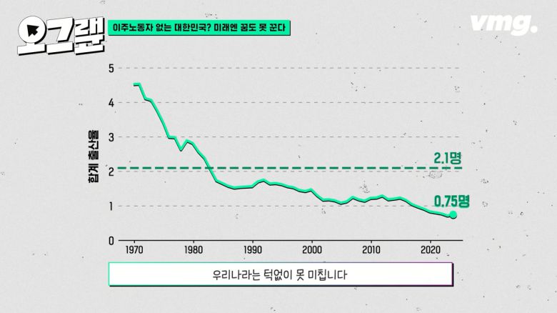 이주노동자의 필요성은 앞으로 더 커질 수밖에 없습니다. 왜냐하면 대한민국의 인구 상황이 심각하기 때문이죠. 작년 우리나라의 합계출산율은 0.75명으로 9년 만에 아주 소폭 반등에 성공했지만 여전히 OECD 회원국 중 꼴찌입니다.