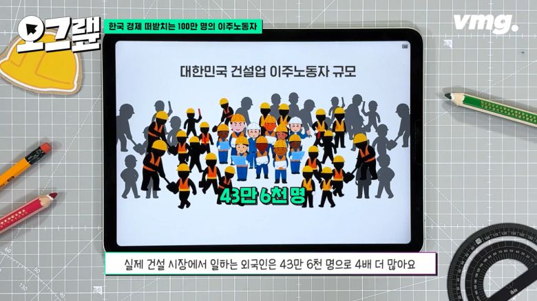 작년에 공식 통계에 잡힌 건설업 이주노동자는 총 10만 8천 명입니다. 하지만 건설근로자공제회가 파악한 실제 건설 시장에서 일하는 외국인은 43만 6천 명으로 4배 더 많아요. 건설 현장에서 만나는 평균 인력 구성비를 살펴보면 한국인이 66.3%, 외국인이 33.7%로 3명 중 1명이 외국인일 정도입니다.