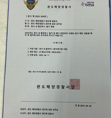 11일 완도해경에 따르면 지난 9일 광주광역시 소재의 한 업체가 '완도해경 흡연 부스 철거 계획'과 관련된 공문을 수신했다며 확인을 요청했다.