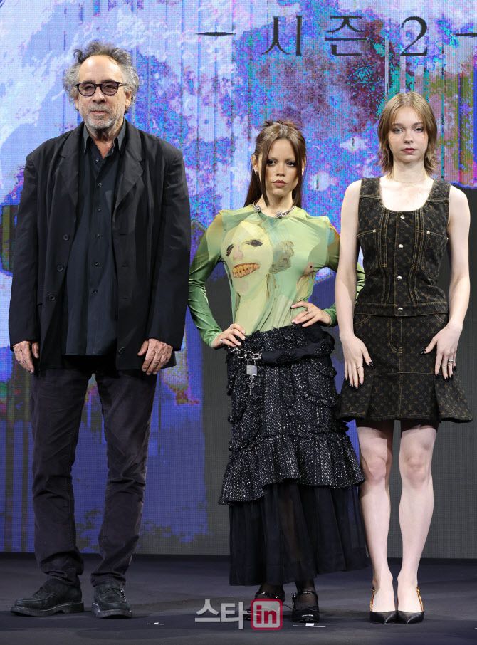 [이데일리 스타in 이영훈 기자] 팀 버튼 감독과 배우 제나 오르테가, 에마 마이어스가 11일 오전 서울 중구 포시즌스 호텔 서울에서 열린 넷플릭스 시리즈 ‘웬즈데이’ 시즌2 내한 기자간담회에서 포즈를 ㅜ치하고 있다.