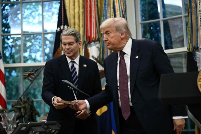 도널드 트럼프(오른쪽) 미국 대통령이 6일 미 워싱턴 백악관 집무실에서 스콧 베선트 재무장관에게 B-2 스텔스 폭격기 모형을 건네고 있다. 워싱턴=AFP 연합뉴스