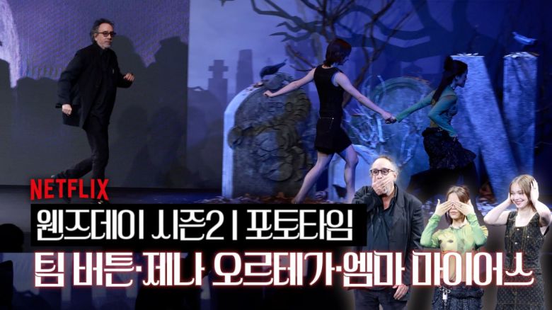 팀버튼 감독, 제나 오르테가, 에마 마이어스가 11일 오전 서울 광화문 포시즌스 호텔에서 진행된 넷플릭스 시리즈 ‘웬즈데이 시즌2’ 기자간담회에 참석했다.