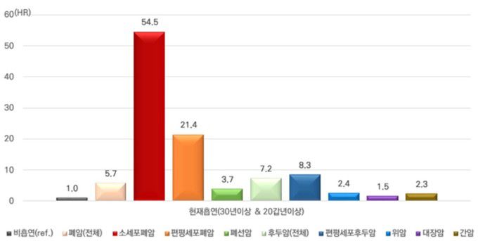 30년 이상·20갑년 이상 흡연자의 발생 위험도는 소세포폐암 54.5배, 편평세포폐암 21.4배, 편평세포후두암 8.3배다. 반면 위암은 2.4배, 간암 2.3배, 대장암은 1.5배로 확인됐다.