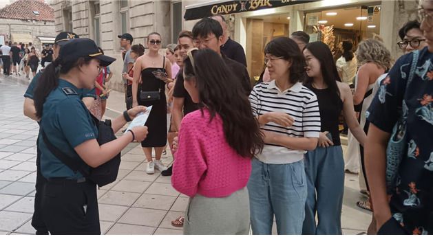 지난달 15일부터 1개월간 크로아티아에 단기 파견된 한국 경찰관이 주요 관광지인 스플리트에서 관광객 대상으로 안전여행 홍보활동을 진행하고 있다. [사진=경찰청] |
