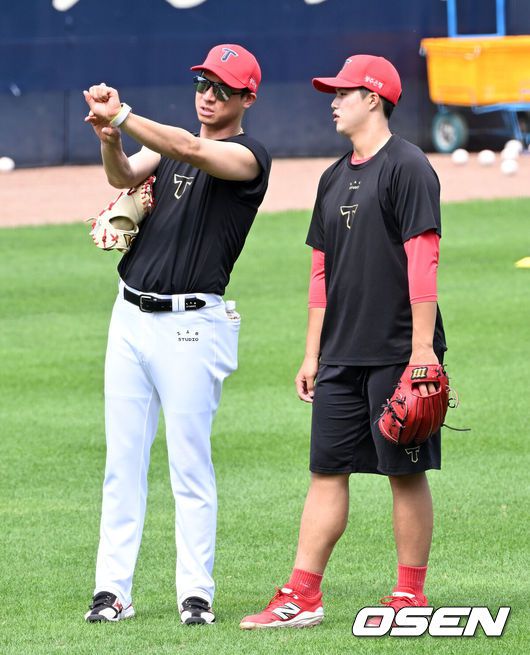 [OSEN=광주, 이대선 기자] 19일 오후 광주-기아 챔피언스필드에서 2025 신한 SOL Bank KBO리그 KIA 타이거즈와 KT 위즈의 경기가 열렸다.KIA는 올러, KT는 배제성을 선발 투수로 내세웠다.KIA 이동걸 코치가 김태형을 지도하고 있다. 2025.06.19 /sunday@osen.co.kr